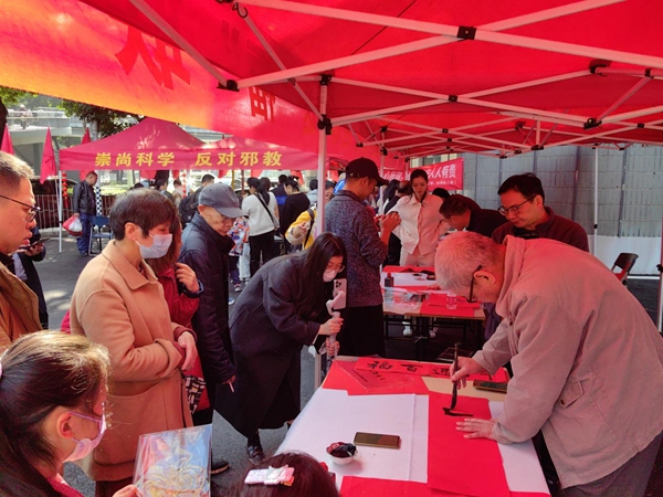 活动现场,应邀参加的书法家们挥毫泼墨,用一副副寓意吉祥、韵味独特的春联传播“崇尚科学 反对邪教”的理念,将平安反邪的元素融入迎春送福的活动中,而糖画、剪纸等民俗活动的“非遗”传承人也大展身手,让现场群众大饱“口服”和眼福,同时也让市民在感受到新春喜庆氛围的潜移默化地学到相关地反邪知识。