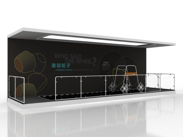 展示内容:展项主要由方轮车和地台等部分构成。 展项设置一个圆形悬链线轨道,方轮车置于起伏的轨道上,通过 圆杆将方轮车和轨道圆心处相连。
