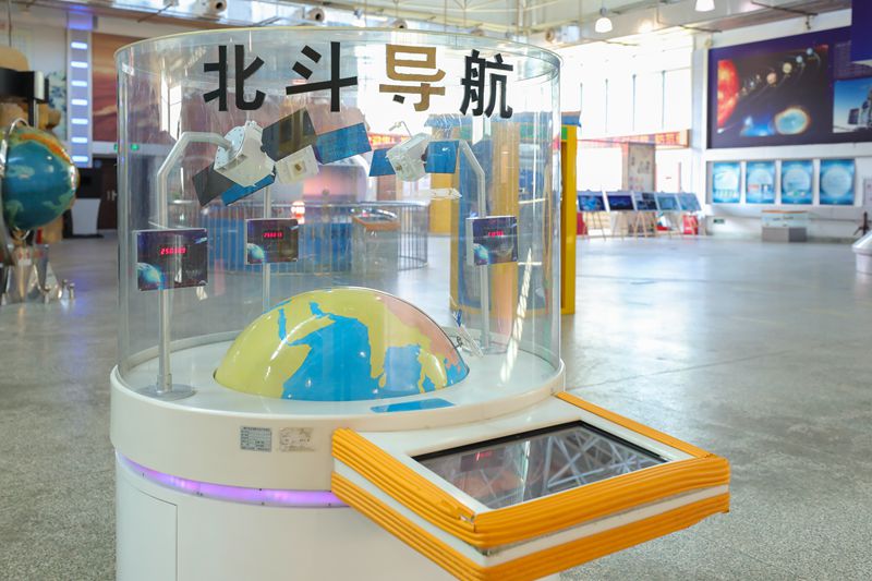 大家看到的是一个北斗导航的模型,是模拟一架飞机从福州起飞,到达法国巴黎,利用北斗导航指示方位、高度、速度等飞行数据,实现正确飞行的目的。