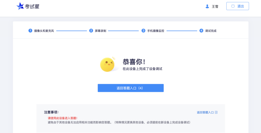 进入调试完成页面,点击"返回答题入口"按钮,即可回到考试说明页面