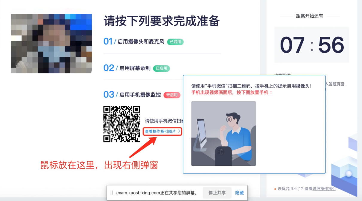 使用手机微信扫一扫页面左侧的二维码,接入视频即可;考试结束后请手动结束视频。